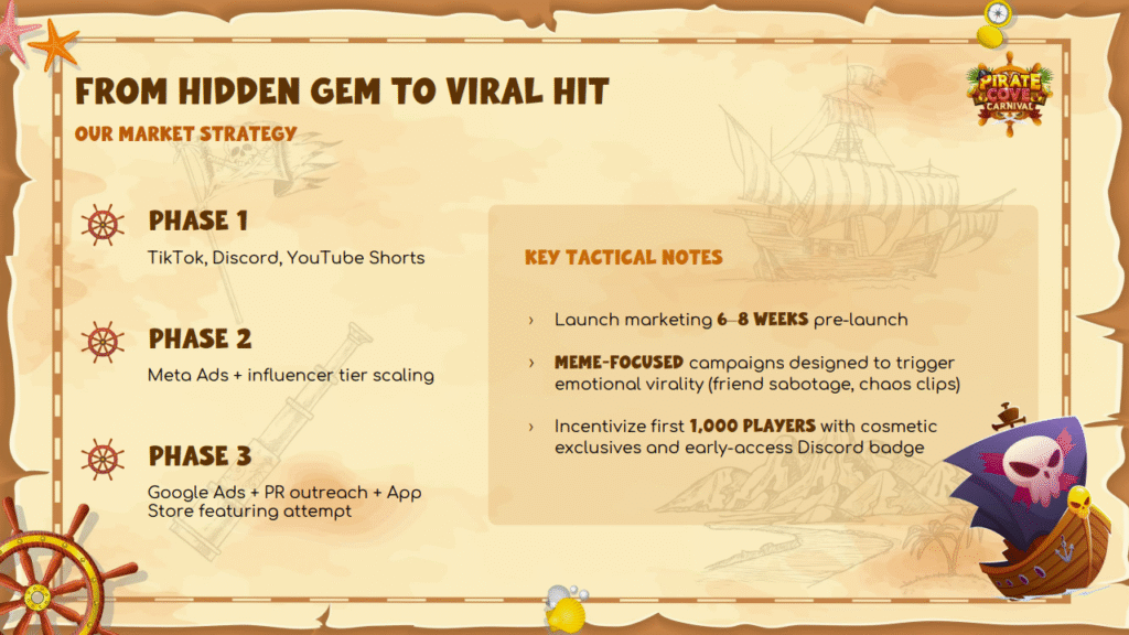 The journey to making Pirate Cove Carnival a viral success begins with a phased approach to marketing. Phase 1 focuses on building excitement through TikTok, Discord, and YouTube Shorts, creating shareable content that encourages community buzz. In Phase 2, the campaign scales with Meta Ads and influencer collaborations, leveraging creators at different tiers to expand reach and build credibility. Finally, Phase 3 emphasizes Google Ads, PR outreach, and efforts to secure App Store featuring for maximum visibility.